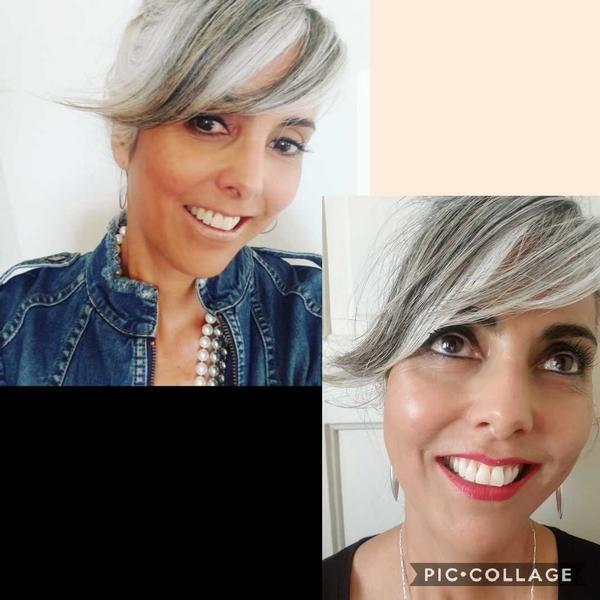 SOOOOO the moral of this story for me is,,,try not to get stuck in the 'there's only one way' to compliment silver/gray hair with make up. Bold/bright and neutral both have a place in this new look---it's about experimenting and taking time to get to know this silver spectrum:)