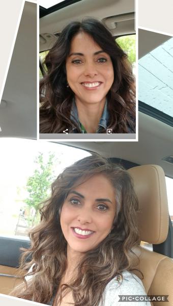 Recent picture after Shellie Highlited my hair for the 2nd time. We used a violet pearl toner to cut out some of the warmth that goes along with lightning ( and colored for YEARS) dark hair.