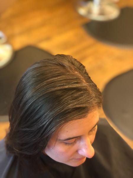 This client wants to continue to grow out her gray. She's feeling like the gray hair is a bit drab and wirey....see solution in next photo......
